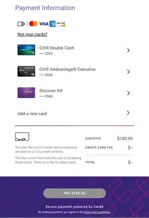 At the time of purchase, CardX informs the customer paying with a credit card the cost of the surcharge and displays the total amount of purchase. CardX also gives consumers the option to pay with an alternative payment method that will not incur a surcharge. In either case, merchants receive 100% of the sale amount.